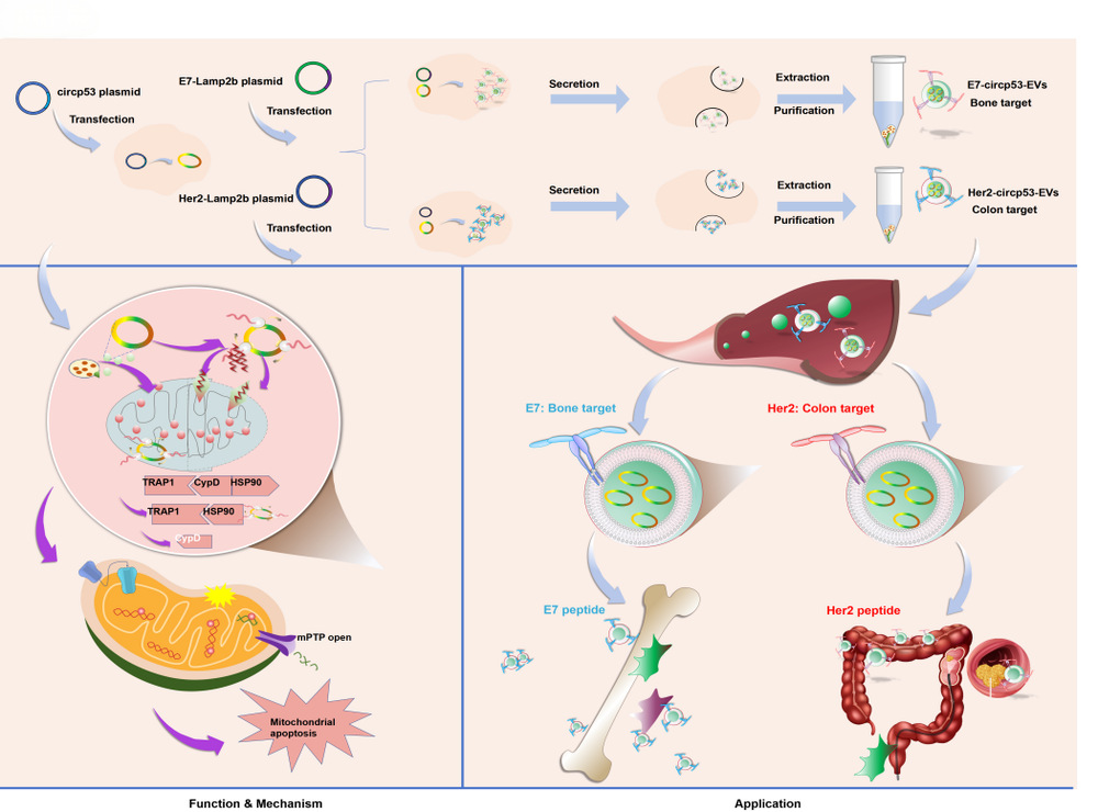 2025年8月1日,医学院杨烨/顾春艳教授课题组的研究论文在Experimental & Molecular Medicine(中科院一区/JCRQ1,IF:12.9)期刊在线发表,题为“Extracellular vesicle-mediated delivery of circp53 suppresses the progression of multiple cancers by activating the CypD/TRAP/HSP90 pathway”。该研究基于环状RNA(circRNA)在肿瘤治疗中的巨大潜力,聚焦于抑癌基因TP53的环状形式circp53(hsa_circp53_0041947),深入探索其在多种癌症中的治疗机制与递送策略。研究发现,circp53编码的功能肽circp53–209aa可独立于p53突变状态发挥作用,通过结合亲环蛋白D(CypD)并破坏CypD/TRAP1/HSP90复合物,从而激活CypD的异构酶活性,诱导线粒体通透性转换孔(mPTP)开放,最终启动线粒体凋亡通路,有效抑制肿瘤细胞增殖。同时,为提升circp53的靶向递送效率,团队开发了两种工程化细胞外囊泡(EV)系统——E7-Lamp2b-EVs和Her2-Lamp2b-EVs,该系统能高效递送circp53至病变部位,显著抑制MM和CRC肿瘤生长,并与化疗药物协同增强抗肿瘤效应。这一突破性成果拓展了circRNA在肿瘤治疗中的应用前景,尤其为TP53突变型等高危难治性癌症提供了潜在的新型治疗手段和理论依据。