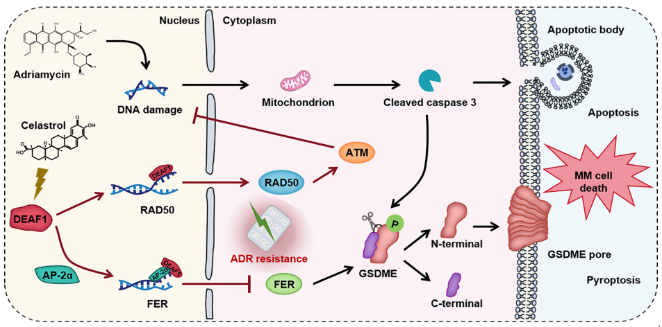 2025年12月19日,医学院杨烨/顾春艳教授课题组的研究论文在Drug Resistance Updates(中科院一区/JCR Q1,影响因子21.7)上在线发表,题为“DEAF1 confers resistance to adriamycin-induced apoptosis and pyroptosis in multiple myeloma”。该研究基于多发性骨髓瘤对阿霉素的耐药现象,利用雷公藤红素为钓饵,结合多数据库筛选,发现转录因子畸形表皮自调节因子1(DEAF1)为其潜在结合靶点,并深入探索了DEAF1在多发性骨髓瘤恶性增殖及阿霉素耐药中的作用机制。研究发现,DEAF1在多发性骨髓瘤中特异性促进肿瘤细胞增殖,并抵抗阿霉素诱导的细胞凋亡与焦亡,进而导致阿霉素耐药。机制上,一方面,DEAF1通过直接转录上调RAD50,激活肿瘤细胞的DNA损伤修复功能,从而发挥促增殖和抗凋亡作用;另一方面,DEAF1通过募集转录因子AP-2α,转录抑制酪氨酸蛋白激酶Fer的表达,进而减少焦亡相关蛋白GSDME的切割活化,抵抗细胞焦亡。此外,研究还证实雷公藤红素可直接抑制DEAF1的转录活性,揭示了阿霉素与雷公藤红素联用的良好协同效果。该研究不仅补充了多发性骨髓瘤阿霉素耐药机制的理论认识,也为雷公藤红素应用于肿瘤治疗提供了新的策略依据。